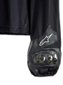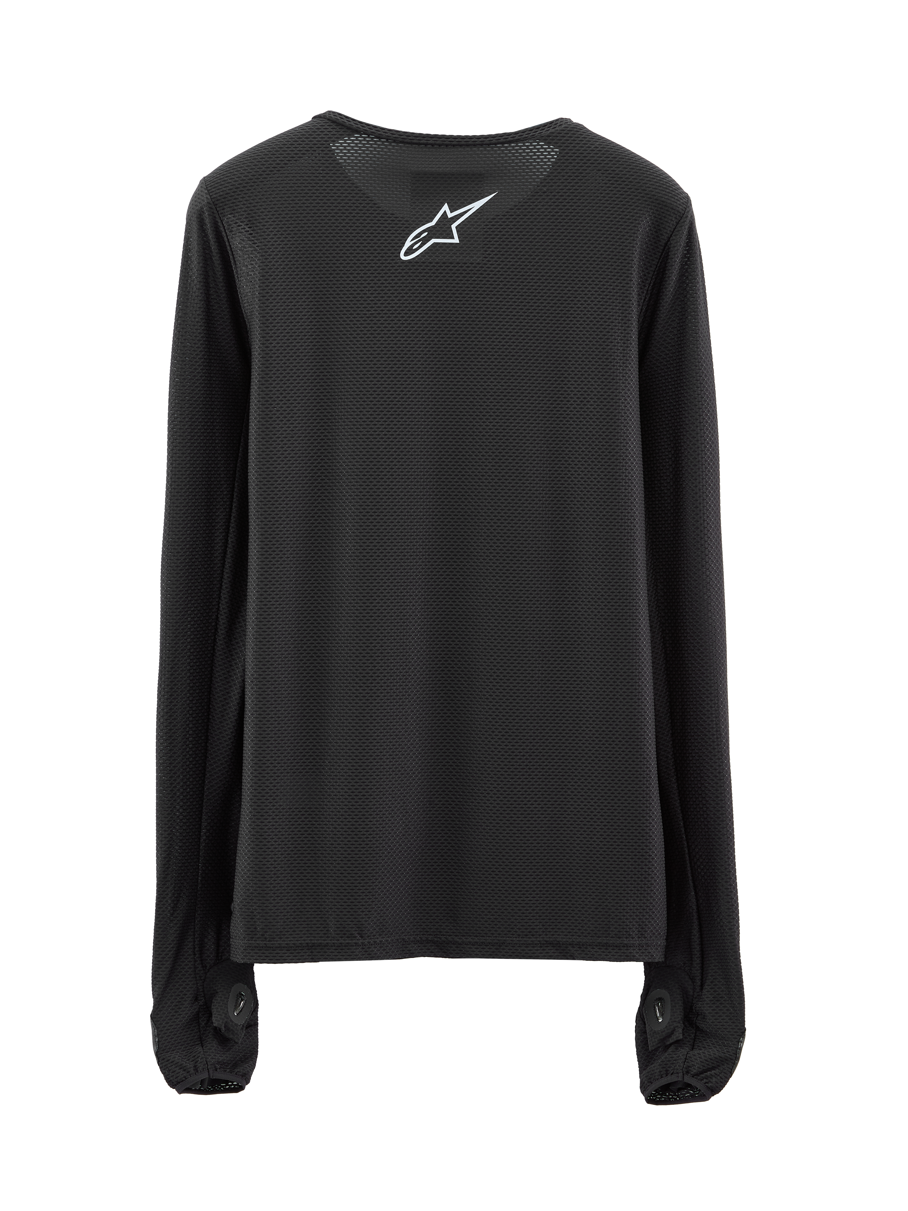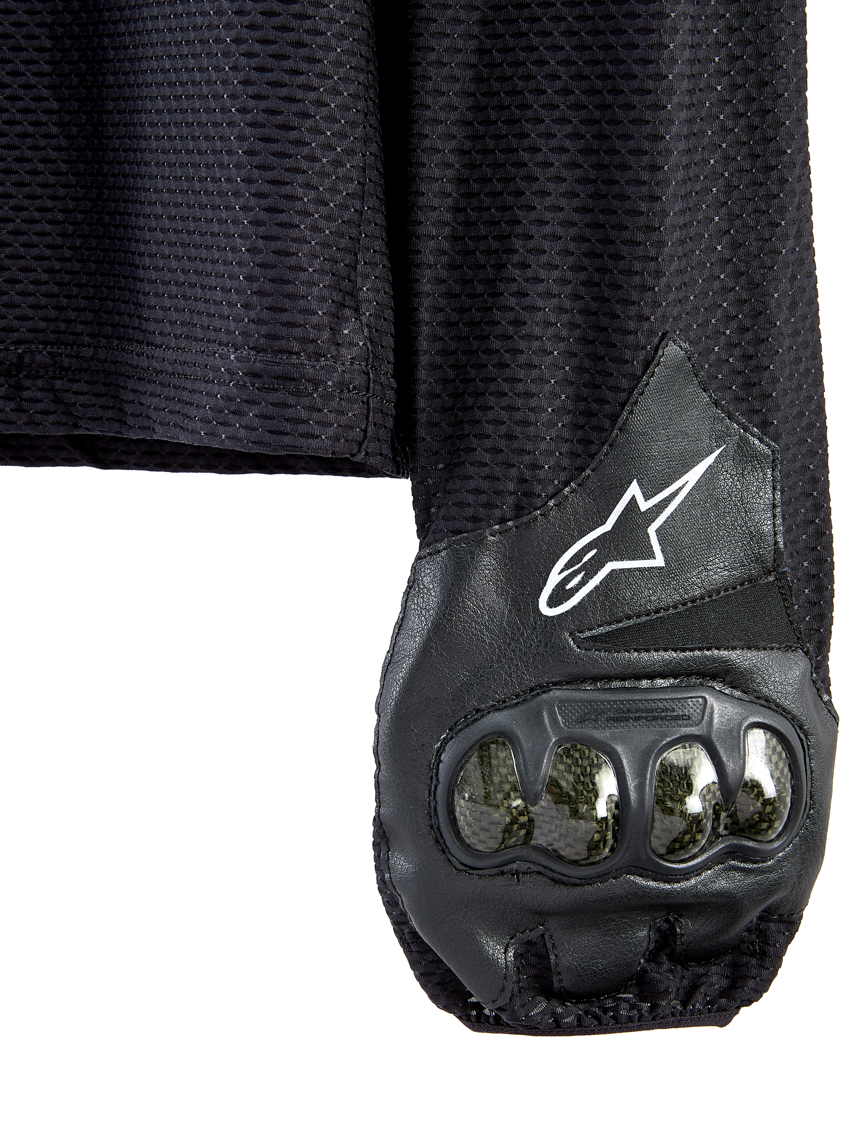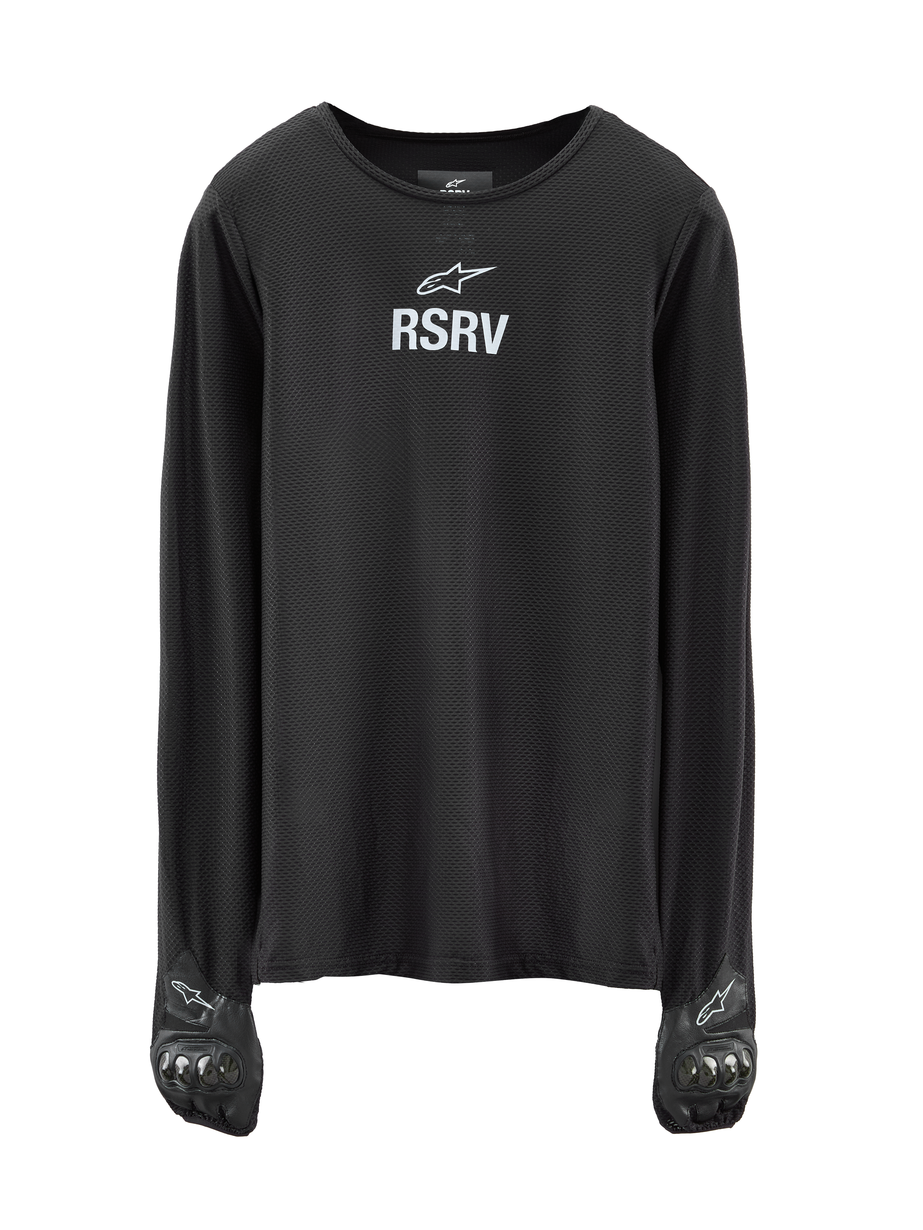 The LS KNUCKLE TEE honors the connection between man and motorcycle and one of the most important contact points between them… the hands. It is a unique hybrid of shirt and glove. The body of the LS KNUCKLE TEE is an extra-long, slouchy silhouette constructed from deadstock mesh material, normally used for Alpinestars technical apparel. To call it “long-sleeved” is almost an understatement. While the sleeves are technically full-length, they are actually significantly more. The protective carbon-reinforced TPU knuckle pieces were plucked from the Alpinestars deadstock gloves bins and affixed to a vegan leather backing, creating a fingerless glove that seamlessly interfaces with the cuff of the shirt sleeves.